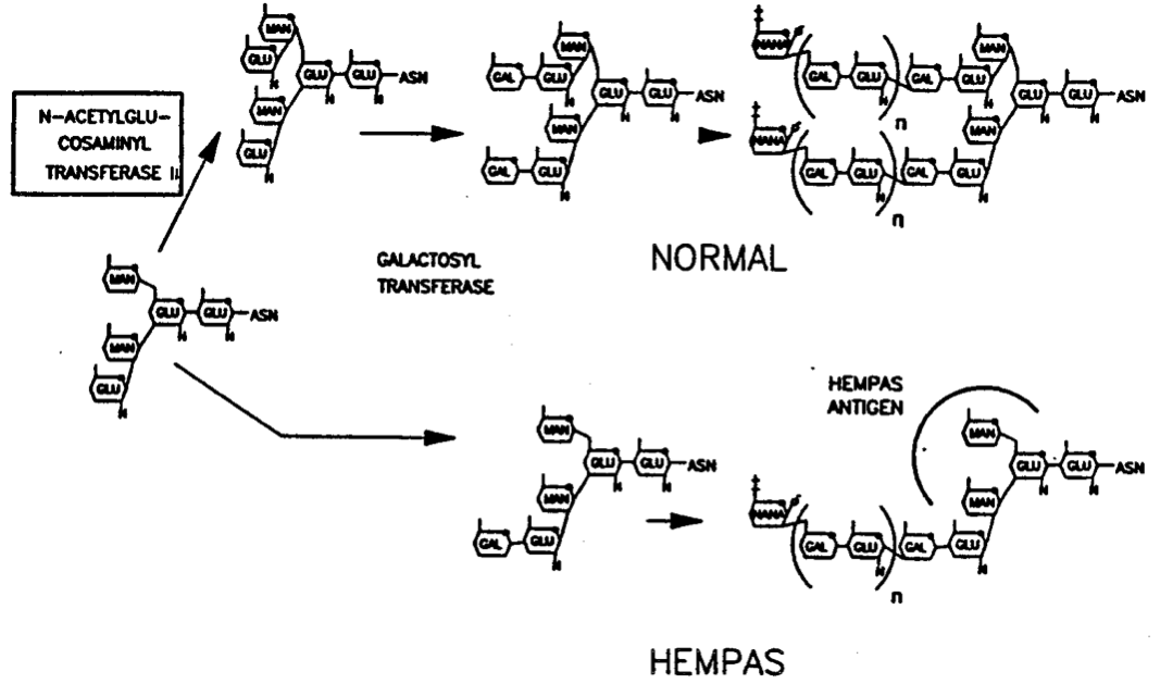 Mechanism: The primary defect in HEMPAS is due to a deficiency of N-acetylaminylglucose transferase and/or alpha-mannose=idase II, enzymes used to cover the HEMPAS antigen by glycosylating a normal membrane carbohydrate moiety known as lactosaminylglycan. However, the relationship of N-acetylaminylglucose deficiency and multinuclearity is not clear.